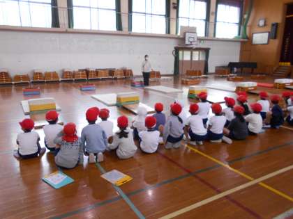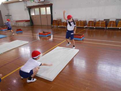 体育館では1年生がとび箱をしていました。