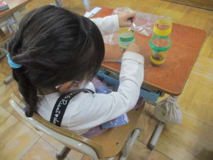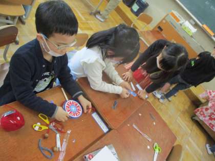 秋見つけで見つけたものを使っておもちゃ作りをして
