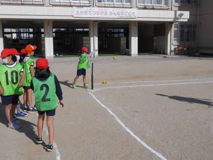 3年生が運動場でハンドベースボールをしていました。