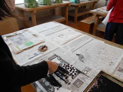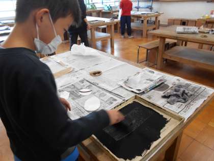 いろいろな材料で版をつくりました。つくった版で、「行ってみたい くに」をどのように表すか、版を置く場所を考えたり、同じ版を繰り返し刷ったりしながら写していきました。紙をめくると「うわ〜いい感じ。」「きれいに形が写ってる。」など楽しみながら版を刷る姿が見られました。