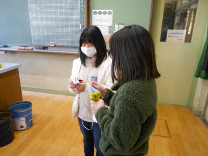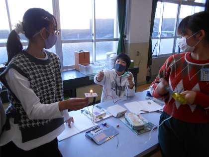 理科室では、手回し発電機を使って豆電球に光をつけていまいした。
