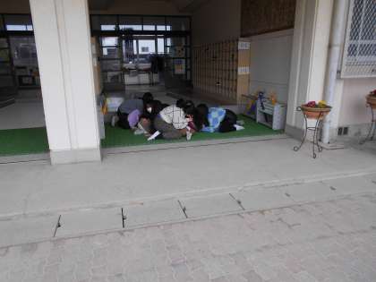 子どもたちには「今週のどこかで訓練をします」とだけ伝えていました。しかし、緊急放送が入った途端、運動場で遊んでいた子どもたちはすぐに運動場の中心に集まり、昇降口付近にいた6年生は、下の学年の子の頭を隠して低い姿勢をとっていました。