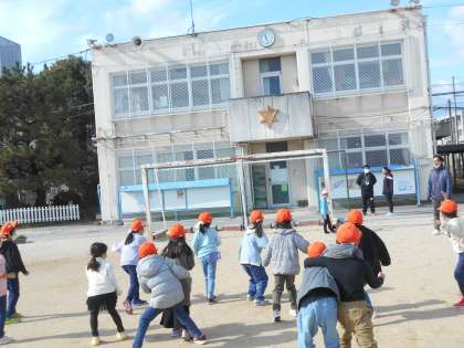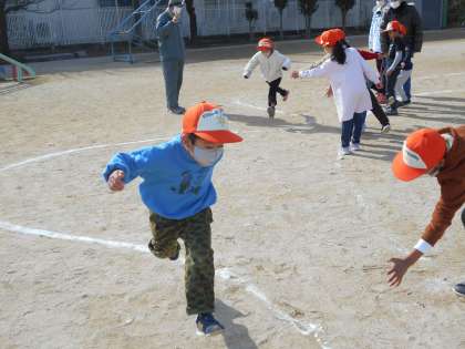 「どんじゃんけんぽん」「やだるまさんがころんだ」「ぼうがい とっぱ」など寒さを忘れるくらい、みんなで元気いっぱい、からだを動かし遊びを楽しみました。