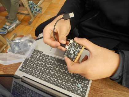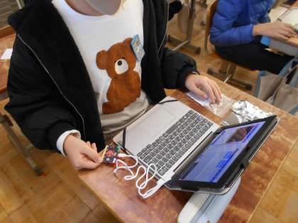 マイクロビットを初めて使ってプログラミングを体験していました。