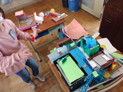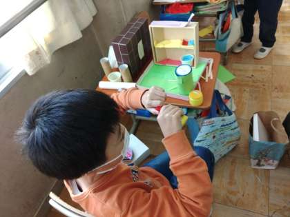「ここのカーテン,こんな風に貼ってみたわ!」「どの辺りに窓をつけようかな・・。」じっくりと作品に向き合い,少しずつ“ともだち”のお家が着々と完成に近づいてきています。