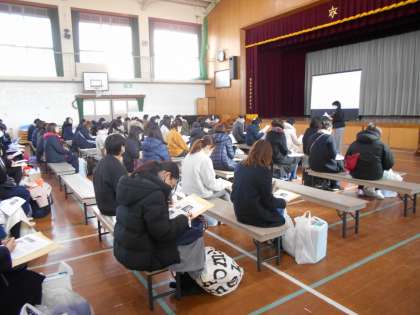 体育館では、物品購入と学校生活について動画をみながら説明会を行いました。