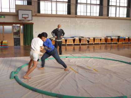 「はっきょい」の掛声で、教職員も力いつぱいぶつかり取組ました。