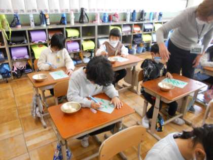 今日の学習は水書での毛筆を行っていました。