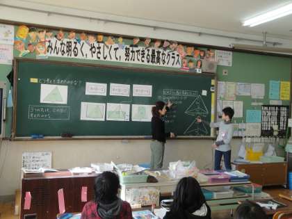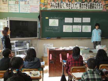 三角形の面積を求める式の表す意味を読み取り,説明していました。