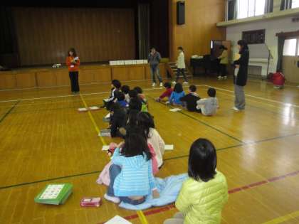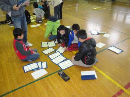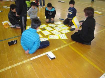 前半は,体育館で百人一首大会をしました。地域の方に札を読んでもらい,楽しく百人一首大会をしました。