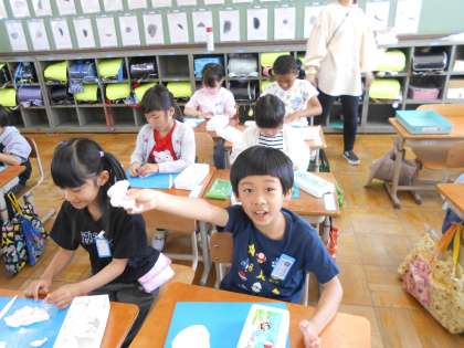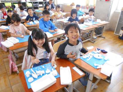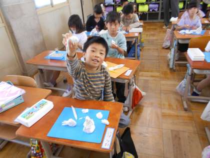 粘土を丸めたり伸ばしたりくっつけたりしながら、造形遊びを楽しんでいます。