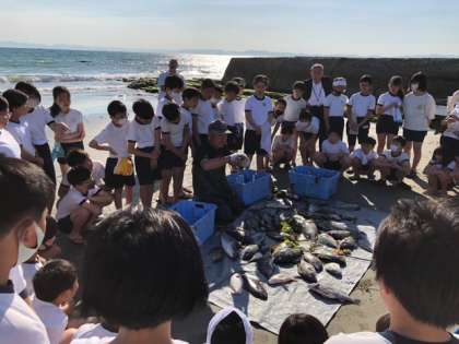漁師さんの説明を聞いて、2箇所に分かれ協力して網を引きます。