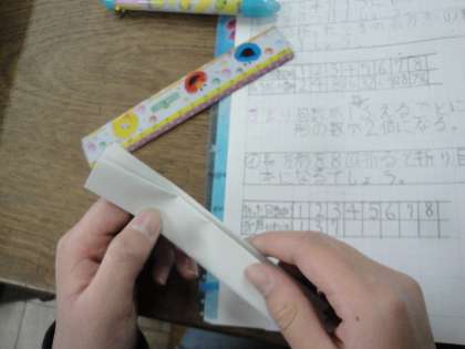 紙を折って数の少ない場合から表にして調べ,数量の関係のきまりを見付けました。