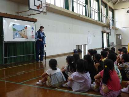 歩道や路側帯のない道路では、右側を通行するということを教えていただき、子どもたちも自分の普段の生活を思い浮かべながら熱心に話を聞きました。