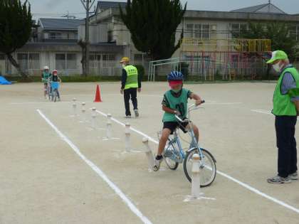 また、チャレンジコースではバランスをとりながらゆっくりと運転する場所やジグザク運転の場もあり、難しいコースに果敢に挑戦する姿が素敵でした。今日の学習で学んだことを普段にいかしていきましょうね。本日は早朝より、伏見署交通課の方やスクールサポーターの方、そして板橋会の交通安全推進委員会の方とたくさんの方々にご協力いただき実施することができました。本当にありがとうございました。