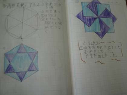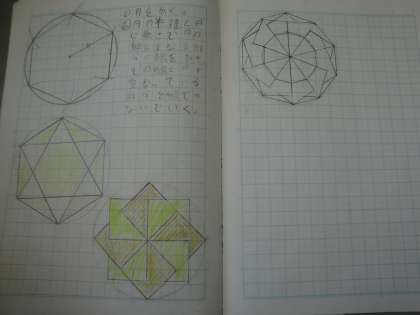 コンパスや分度器を使って,正多角形を利用した様々なもようを作りました。