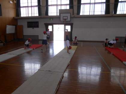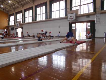 マット運動をしていた5年生。組み合わせ技にチャレンジしていました。