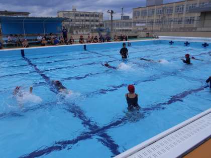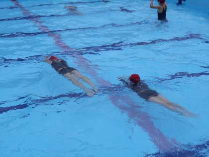 風が吹くと少し寒いようですが、水泳学習を楽しんでいました。