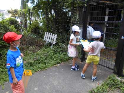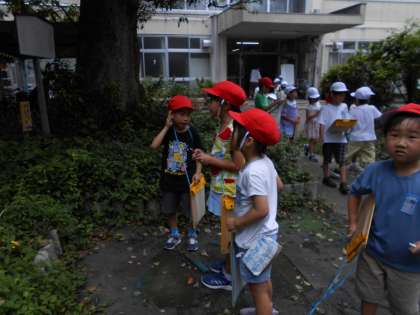 今日の生活科は教室をとび出し「おとを さがして あそぼう」の学習をしています。