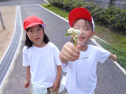 四つ葉のクローバーを探したりシロツメクサを集めたり、木の根っこをみつけたりしています。