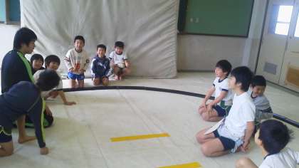 先生だけでなく,中学生の先輩にも教えてもらいながら,相撲だけでなく,遊びを使ったトレーニングをしてさわやかな汗を流しました。