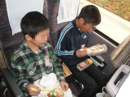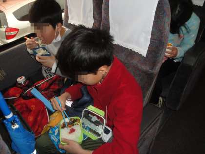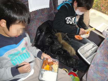 お楽しみのお弁当の時間です。友だちと仲よく会話しながら美味しくいただきました。