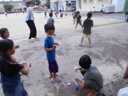 容器に水を入れて飛ばしたり掛け合ったりもしていました。