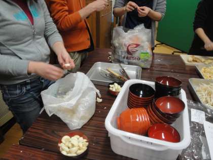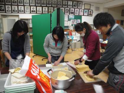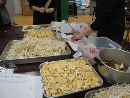 午後6時前。「ふれあいサロン」では,PTAの役員の方と教員による「ちゃんこ鍋」の仕込みが行われていました。