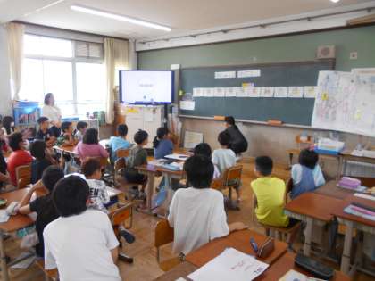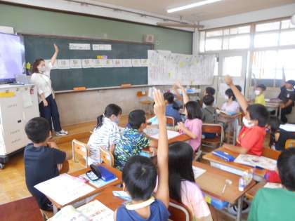 ジェスチャーしている様子を見て、グループで話し合って英語で答えていました。