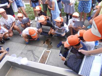 流れる水のはたらきの実験をしています。
