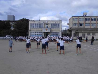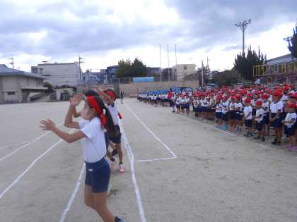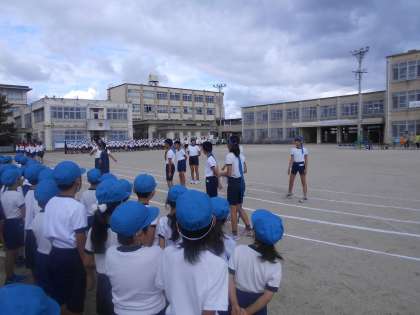 今日の全校練習はオープニングセレモニーで行うエール交換や縦割り種目の大繩跳びに取り組みました。