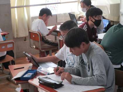 世界の平和について調べ学習をしています。それぞれが決めたテーマをもとに現状と自分たちにできることを考え、まとめているところです。