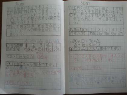 2つの数量の関係を○や△を使って式に表し,変わり方を表に書いて調べました。