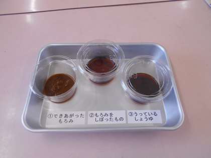 味見では、1.できあがったもろみ 2.もろみをしぼったもの 3.うっている醤油の3種類をいただきました。