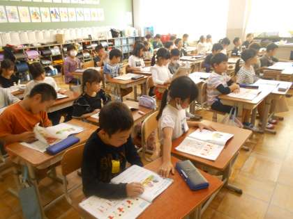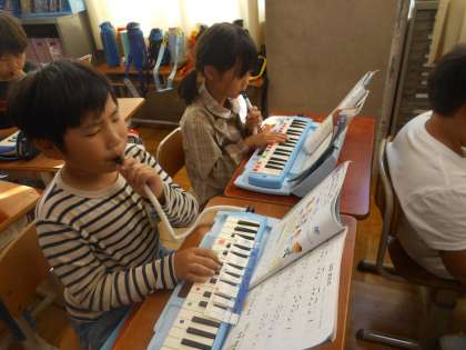 鍵盤ハーモニカを使ったり手拍子したりしながら楽しそうに学習しています。