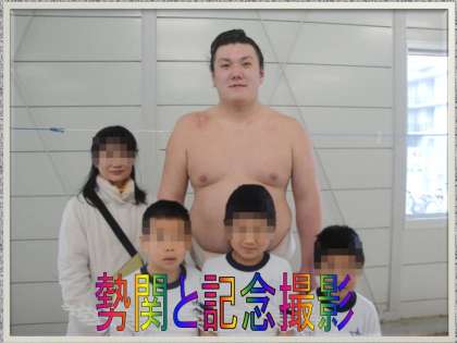 全員での記念撮影終了後,親方と勢関に記念撮影をお願いしたところ,快く応じてくださいました。