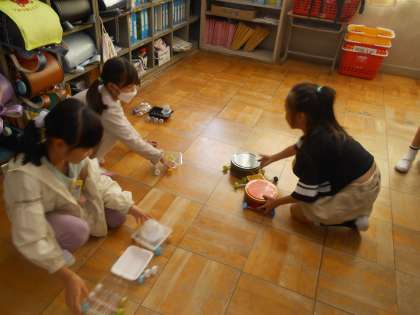 集めた物の特徴を生かして、積んだり、転がしたり、はじいたりしながら楽しそうに遊んでいました。