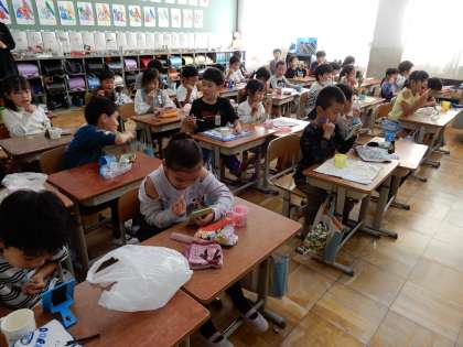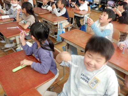 歯ブラシの持ち方や手鏡を見てブラッシングの方法を学んでいました。