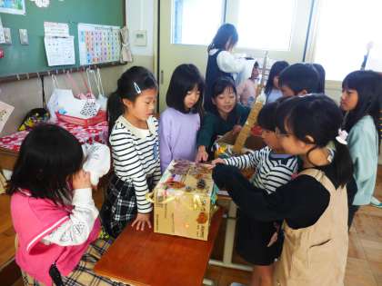 生活科「あきといっしょに」の学習で、「あきまつり」を計画している1年生。