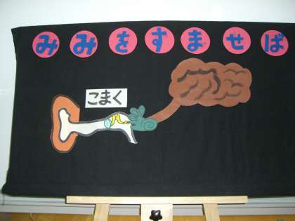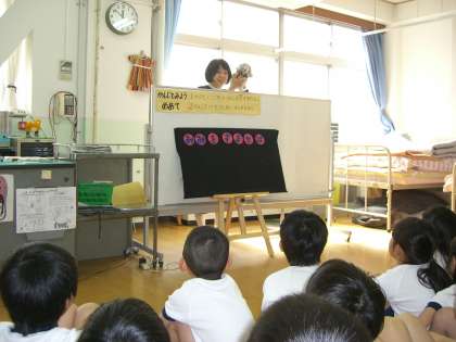 3月の身体計測前の保健指導は「みみをすませば」でした。ホワイトボードの裏で,3種類の音を出しました。1つ目は「新聞紙を丸めた音」,2つ目は「鉛筆をお盆の上で転がした音」,3つ目は「2つの石でたたいた音」でした。子どもたちが目を閉じて,耳をすませて一生懸命に聞いている様子がとてもかわいらしかったですよ。普段の生活の中でも,耳をすませていろんな音を感じてほしいなぁと思っています。