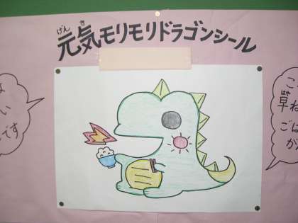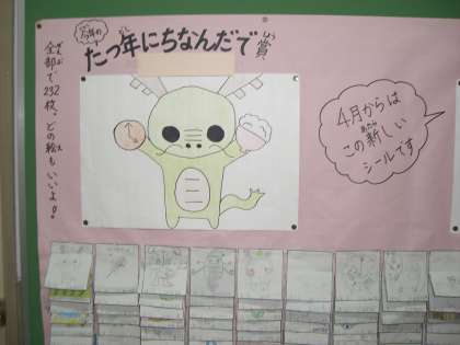 保健安全委員会では1月末から2月の半ばにかけて,新しいシールの絵を全校に募集しました。232枚ものかわいい絵が集まり,選ぶのが大変でした。そこで3枚選び,それぞれに委員会で考えた名前を付けました。「たつどしに ちなんだで賞」「アイディア賞」「元気モリモリドラゴンシール」です。その中で,来年度のシールになるのは「元気モリモリドラゴンシール」に決定しました。集まった絵はすべて,保健室前の掲示板にはっています。見に来てくださいね。