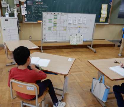 交流学習にいく時間をホワイトボードに貼っています。