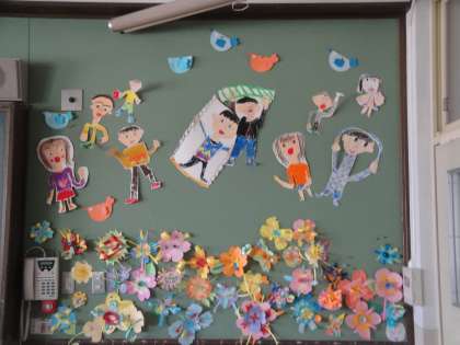 1年生の各教室は,新しい春にふさわしいきれいな掲示物が飾られています。