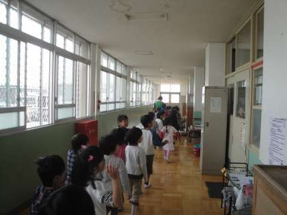1年生は担任の先生と一緒に校内のどこに何があるのかを歩いて覚えました。