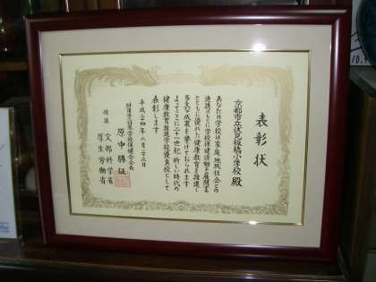 うれしい知らせが届きました!財団法人日本学校保健会より,全国の92校の1つとして,平成23年度の健康教育推進学校表彰に選ばれました。平成22年度には京都府健康教育推進優良校の「健やか賞」も受賞し,子ども,家庭,地域,そして学校が一緒になって取り組んできた「早ね・早起き・朝ごはん」を中心とした健康教育の取り組みを評価していただいています。