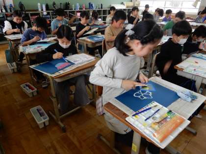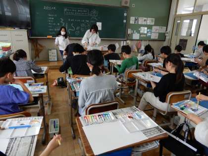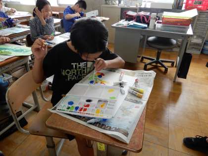 ストローで絵の具を吹き流したり絵の具を網にのせブラシでこすって飛び散る方法を使ったり、みんな工夫しています。