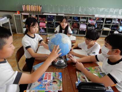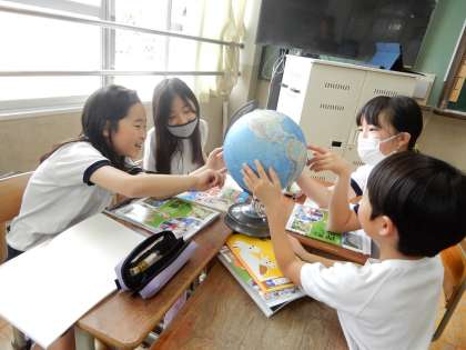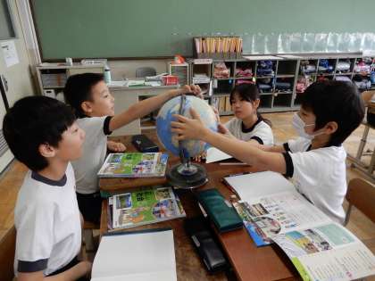 地球儀を見て気付いたことを話し合っていました。