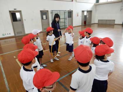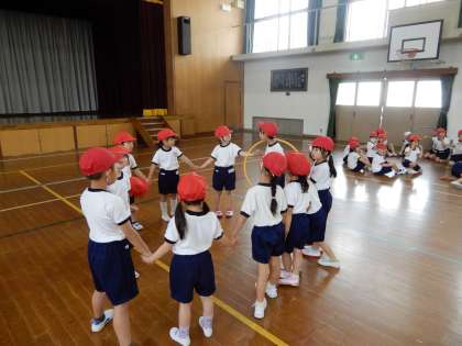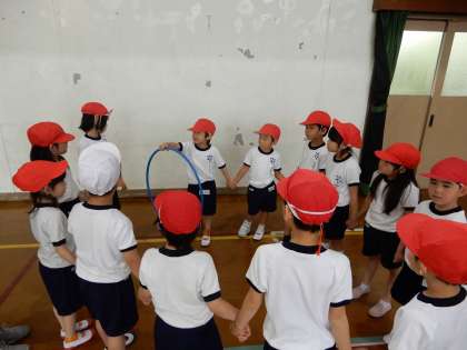 手をつないで円になりにフラフープを送る活動を楽しんで行っていました。