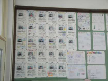 自己紹介カードや学級目標など,子どもたちが一生懸命作ったものが掲示されています。