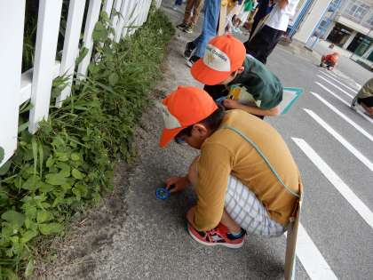 ダンゴムシを手のひらにのせてじっくり見ています。新たな発見があったかな。